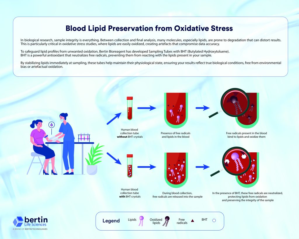 Bertin Bioreagent BHT Tubes are designed to counteract this instability. Each tube is coated with BHT (butylated hydroxytoluene), a well‑known antioxidant capable of neutralizing free radicals before they reach sensitive lipid molecules. By limiting peroxidation at the moment of sampling, these tubes help maintain the physiological state of lipids throughout handling and storage.